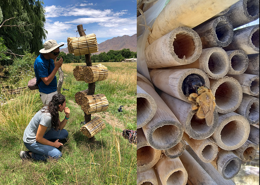 Dado que las abejas Xylocopa nidifican en cavidades de madera, la investigadora evaluó cómo la disponibilidad de estos recursos influye en su presencia. Para ello, implementó nidos artificiales (secciones de madera que funcionaron como “hoteles para abejas”) y analizó la disponibilidad de cavidades naturales en el paisaje. Los resultados confirmaron que estos nidos artificiales pueden complementar los recursos naturales y favorecer la presencia de estas abejas beneficiosas en los campos.