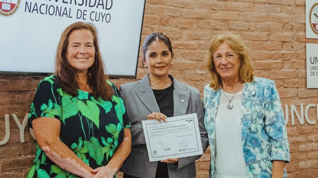 Teresa Damiani (secretaria de Investigación, Internacionales y Posgrado), Victoria Gimenez (Investigadora IADIZA) y Esther Sanchez (Rectora UNCuyo). Foto: UNCUYO.